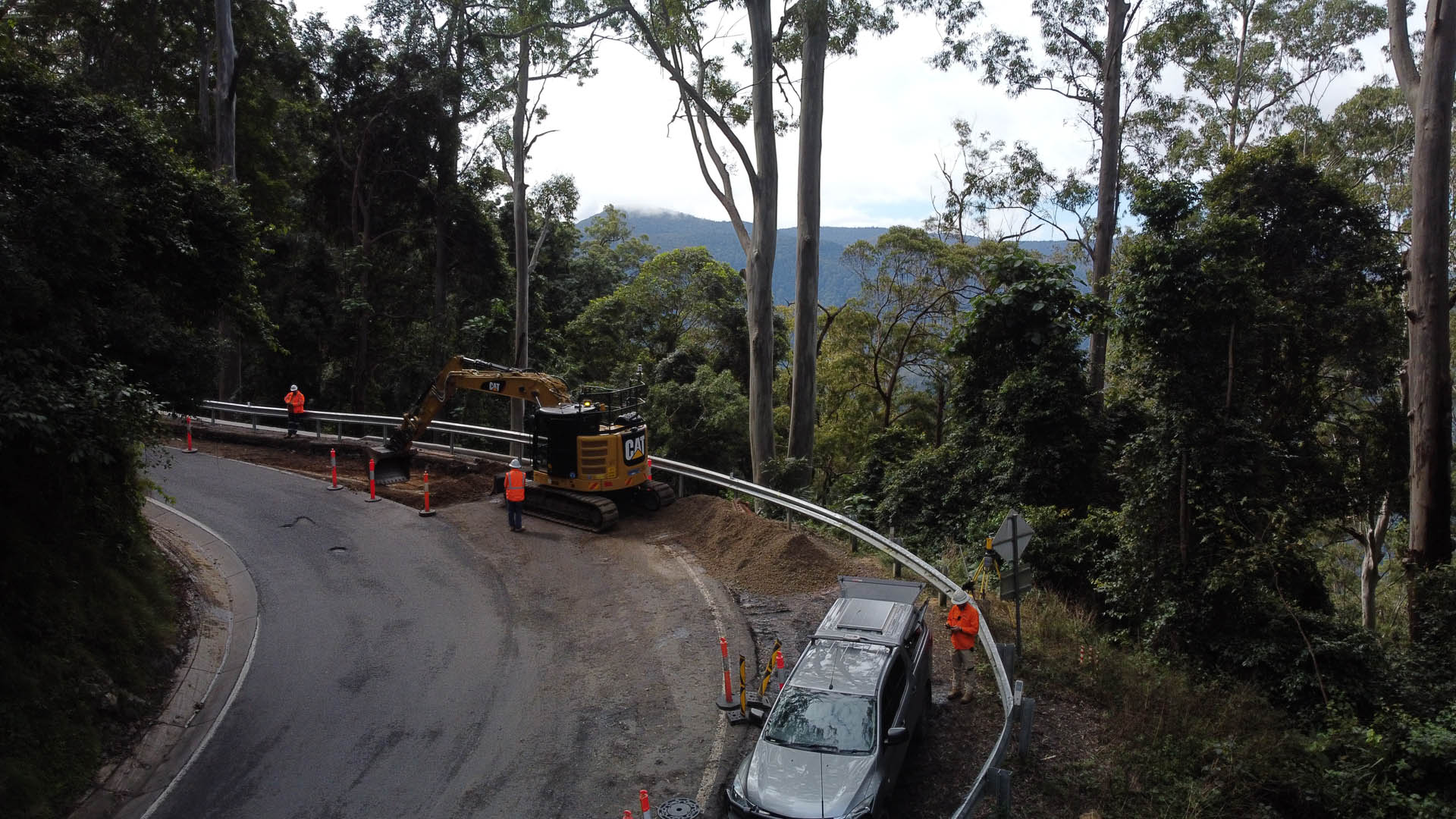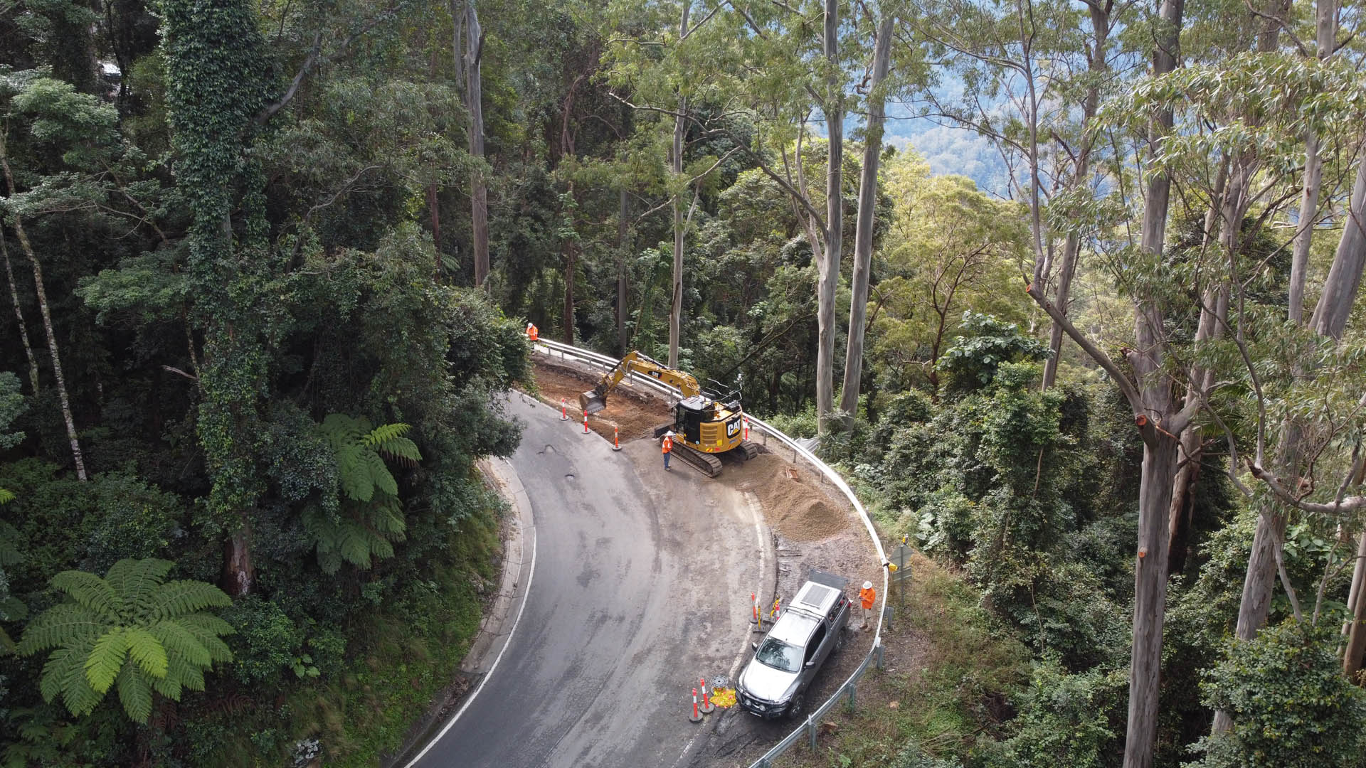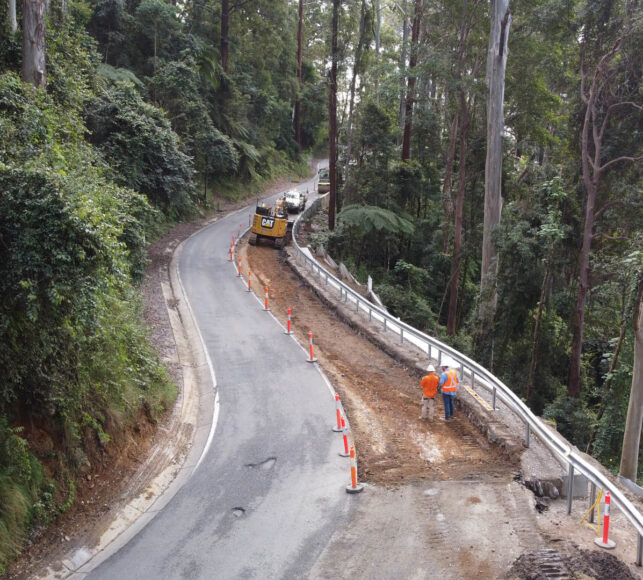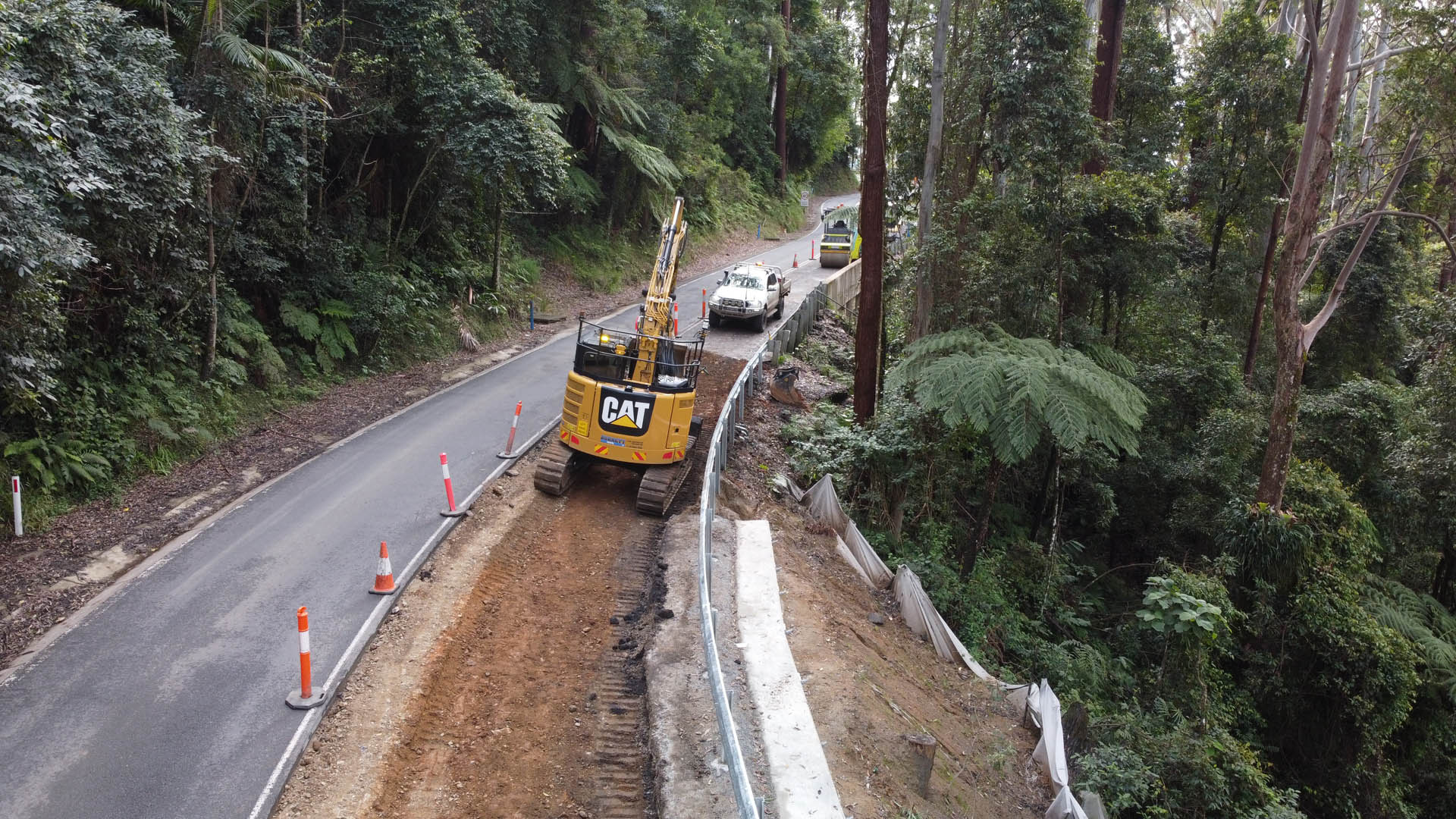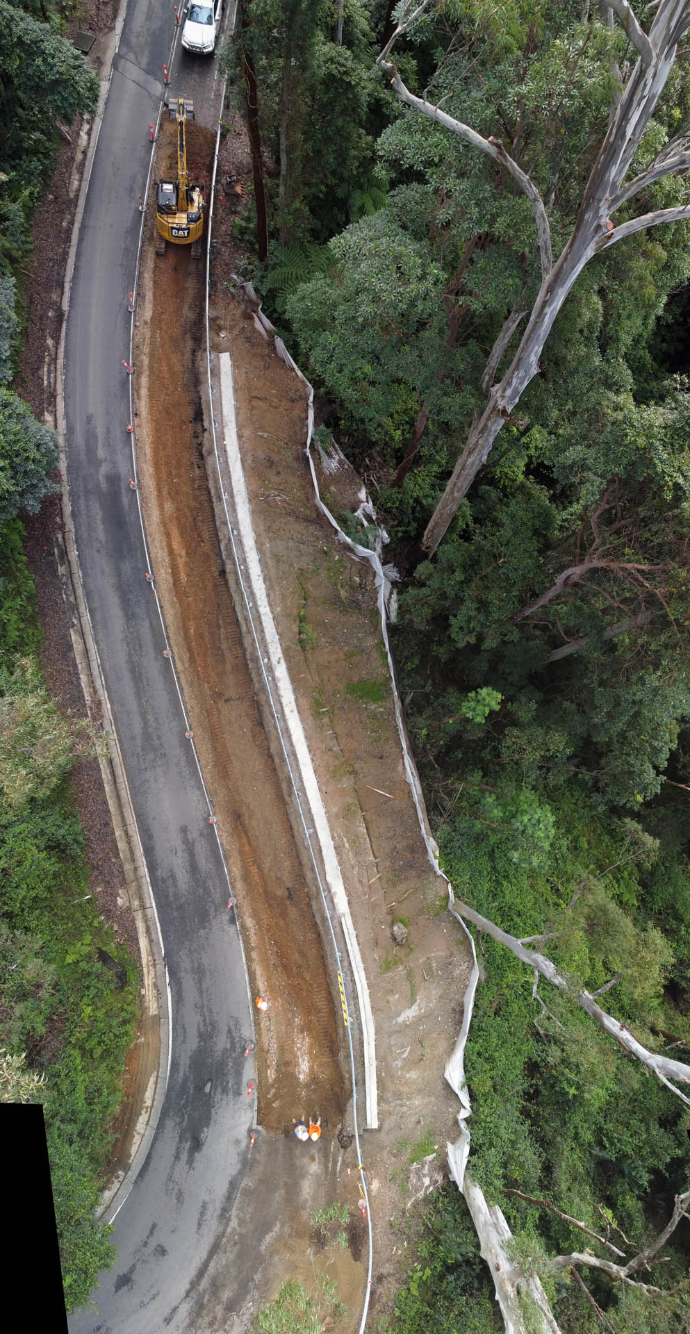 This section of embankment rehabilitation works consisted of the contractor installing rock bolts over the outside of the road bank and we excavated and removed the failing unsuitable road base materials and replaced with stabilised road base in compacted layers and topping with asphalt. The use of more specialised machines made this job easier and more cost effective.